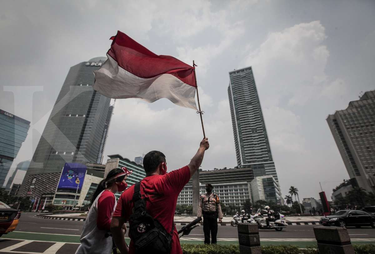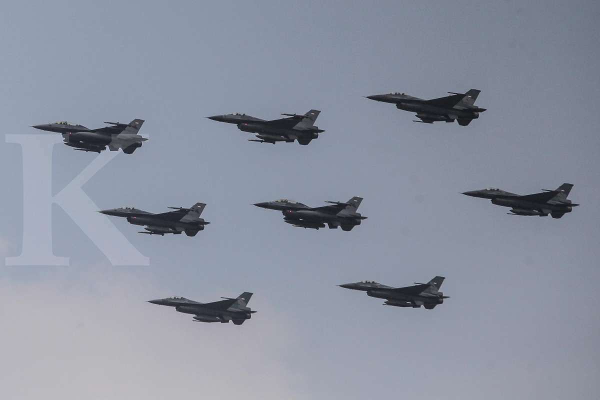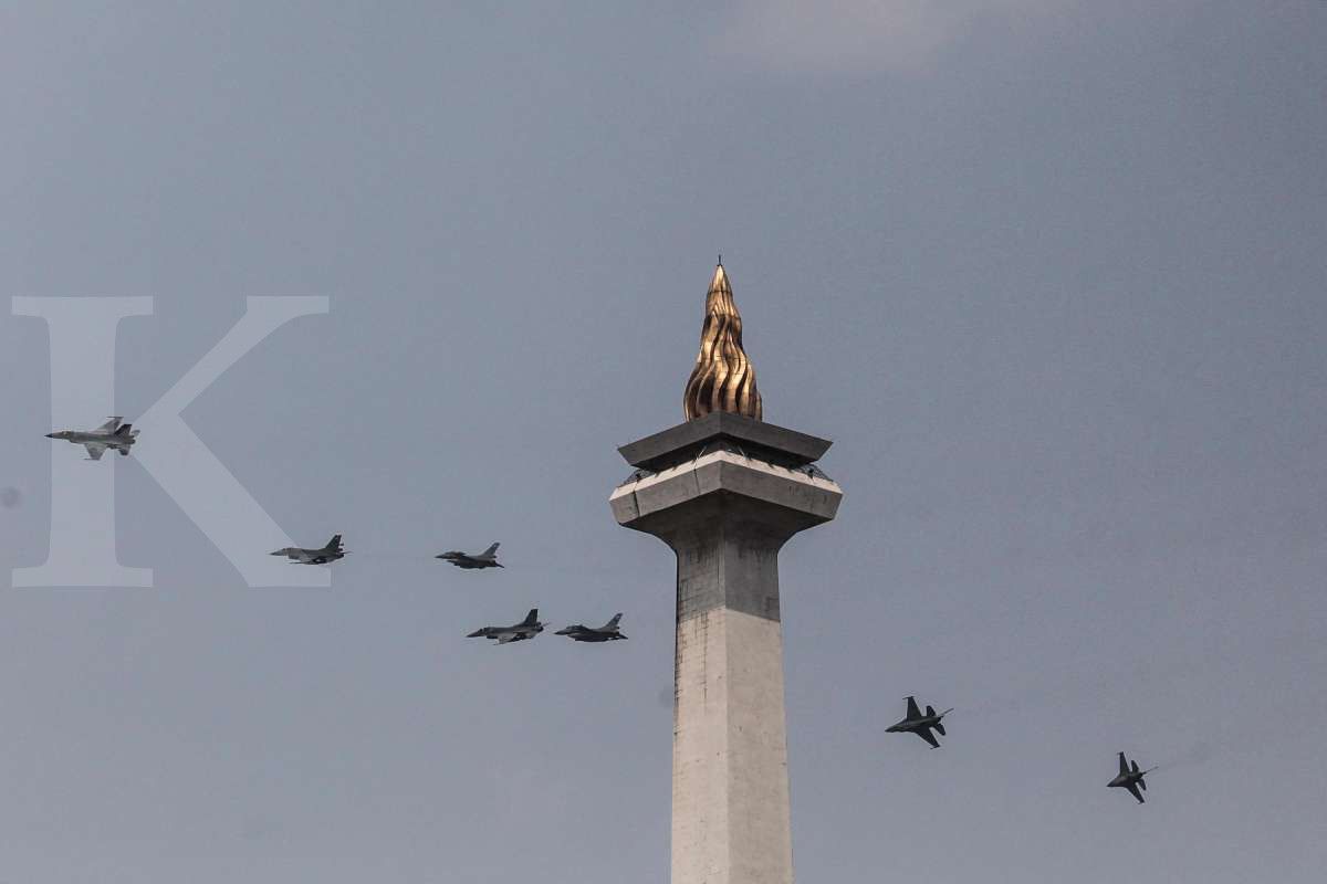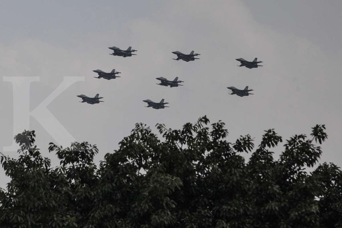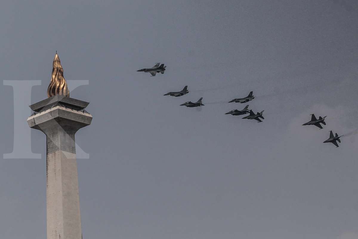 Sebanyak delapan pesawat tempur F-16 milik TNI Angkatan Udara memeriahkan peringatan HUT ke-76 Republik Indonesia pada Selasa (17/8/2021). Pesawat-pesawat yang membentuk formasi arrow head tersebut melintas saat upacara peringatan detik-detik proklamasi kemerdekaan RI digelar di Istana Merdeka, Jakarta Pusat.