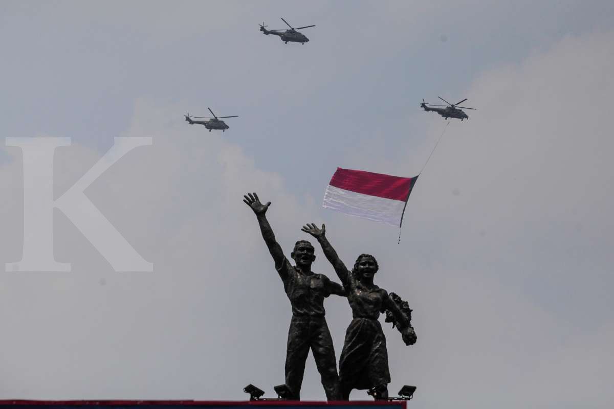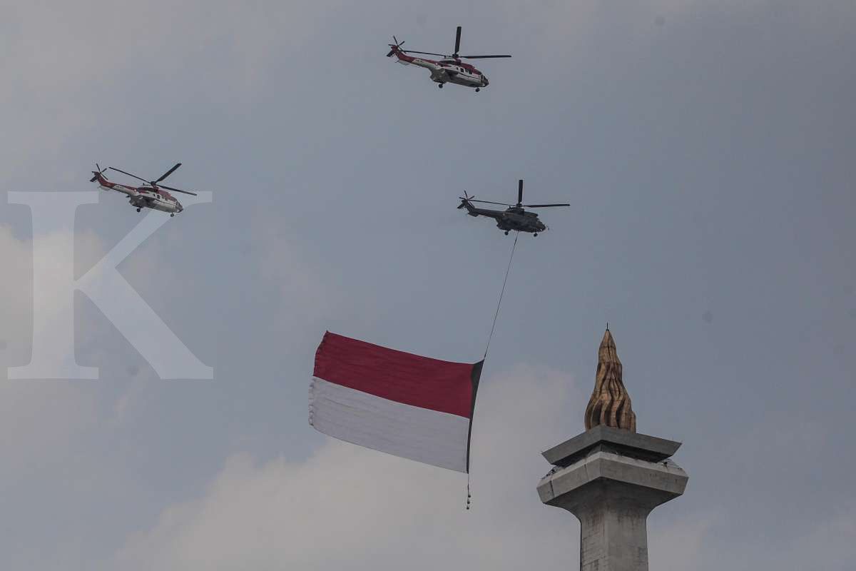Tepat setelah formasi jet tempur melintas, enam helikopter TNI AU dalam misi Nusantara Flight juga melakukan fly pass dengan membawa dua bendera Merah-Putih raksasa. Bendera berukuran 20x30 meter dikibarkan dalam momen perdana yang pernah digelar dalam peringatan HUT Kemerdekaan RI.
