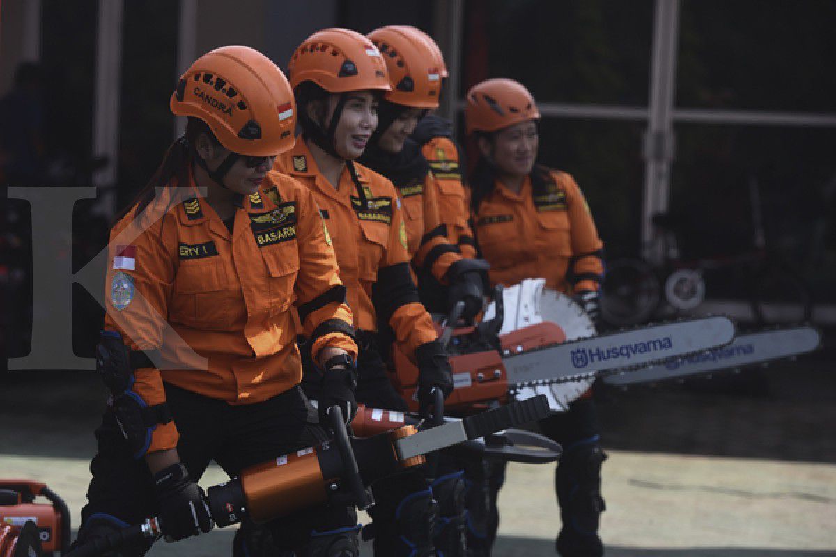 Sekitar enam rescuer atau penyelamat perempuan Basarnas tengah sibuk melengkapi dirinya dengan peralatan keamanan, sesekali mereka bercanda dengan para rescuer pria.