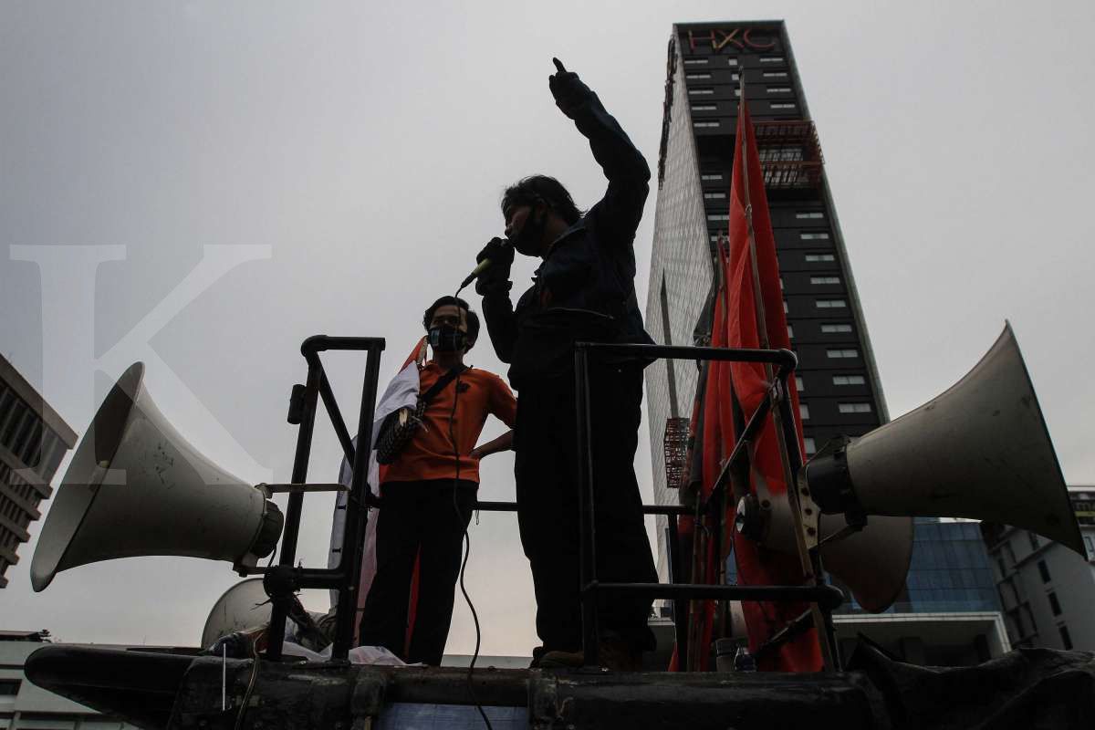 "Tidak dibayarkannya BPJS selama tiga bulan dan tidak dilunasinya uang THR kawan-kawan semua," ucap Angga saat berorasi di atas mobil komando milik FSPBI.