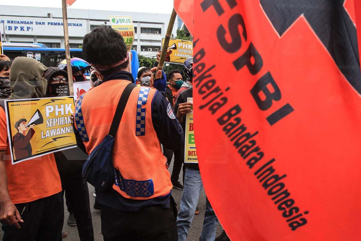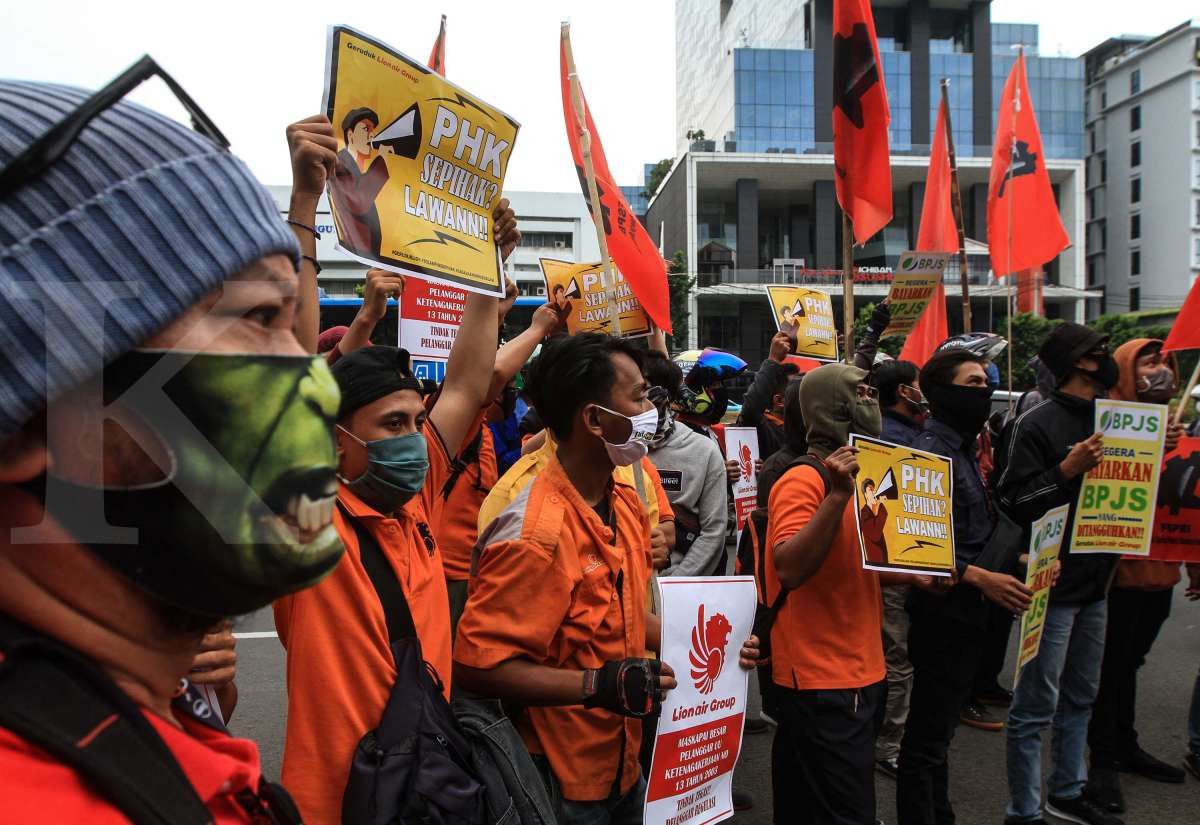 Federasi Serikat Pekerja Bandara Indonesia (FSPBI) dan pekerja-pekerja Lion Air yang terkena PHK berunjuk rasa di depan Lion Air Tower, Jakarta, Senin, (13/07/2020).